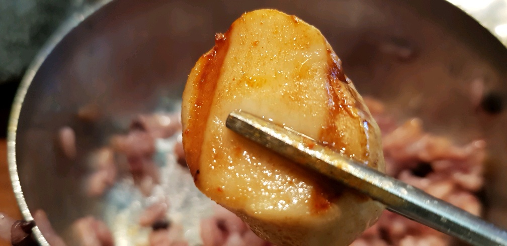 노릇노릇 잘 구워진 고기랑 버섯을 같이나온 멸치젓갈?? 갈치젓?? 에 살짝 찍어서 먹었는데