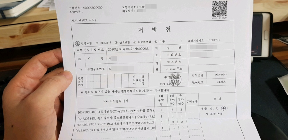 여튼~ 치료 받을 때 너무 떨어서 정신이 혼미한 상태로 거즈를 물고 처방전 받고,