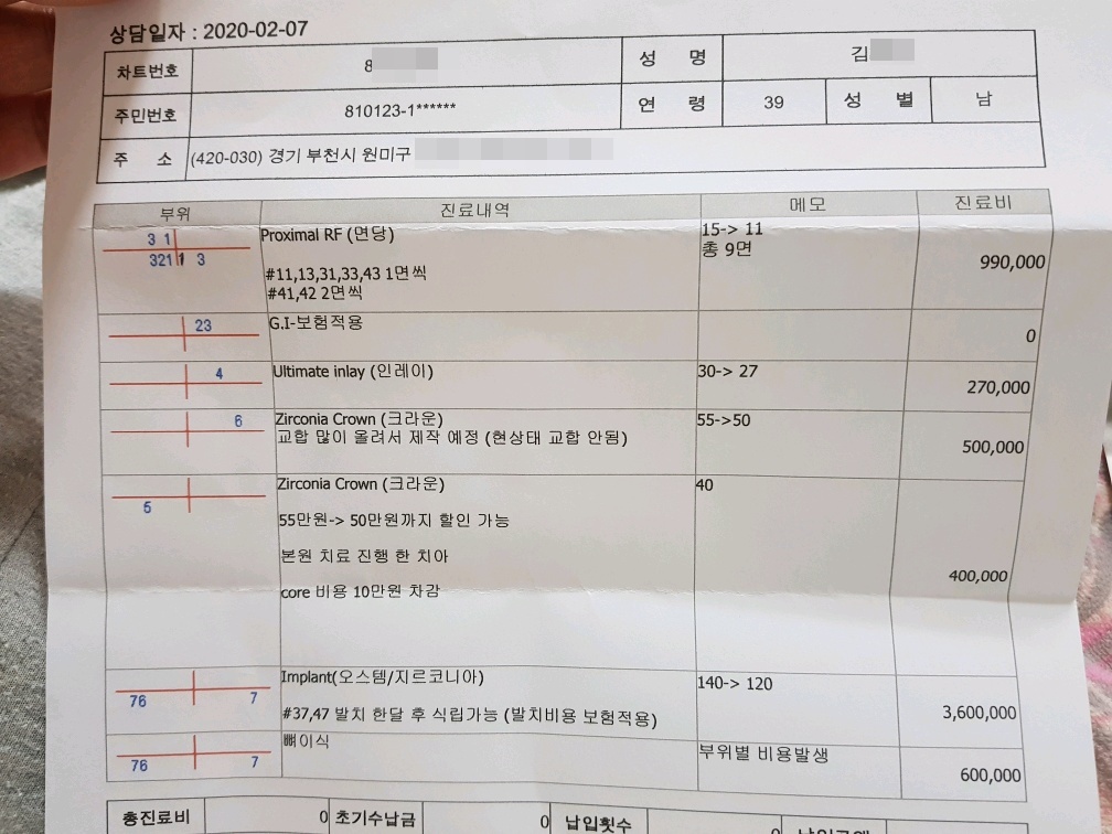해서 임플란트 포함 치료할 치아들 견적 상담 받은 결과...