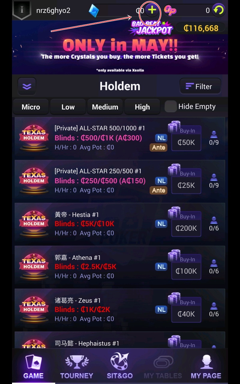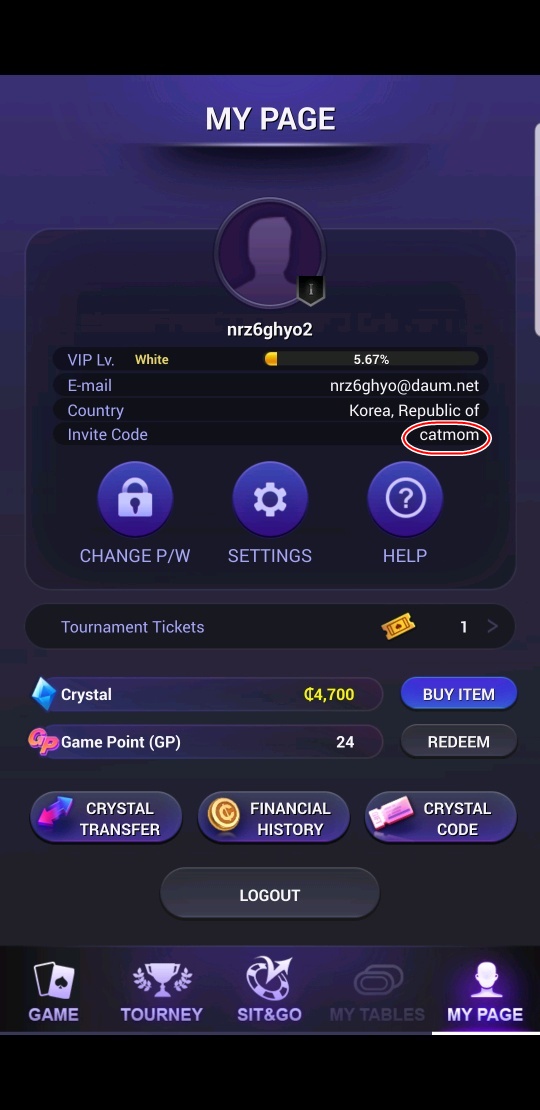 쿠폰 등록 방법은 이미지에 나와있듯 휴대폰에서>Menu > Account > Tournament Tickets > Code 란에