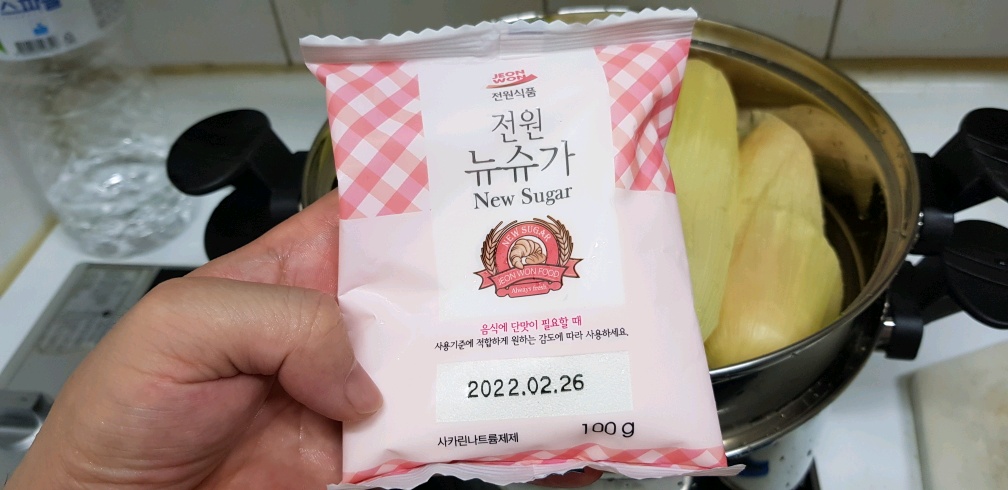 옥수수는 뉴슈가 2스푼만 넣고 30분 삶고, 불끄고 10분정도 뜸 들이는게 답이더군요.