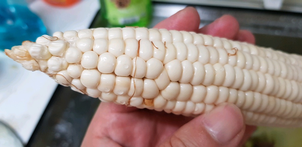 옥수수 알갱이 보이시죠? 흰색이 이렇게 탱탱하고, 물을 살짝 머금은게 보이면 다 익은겁니다.