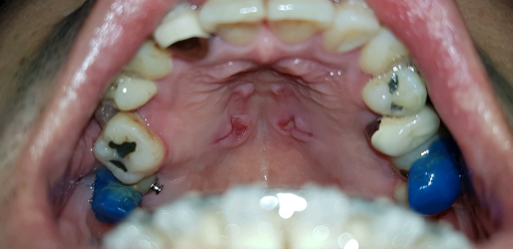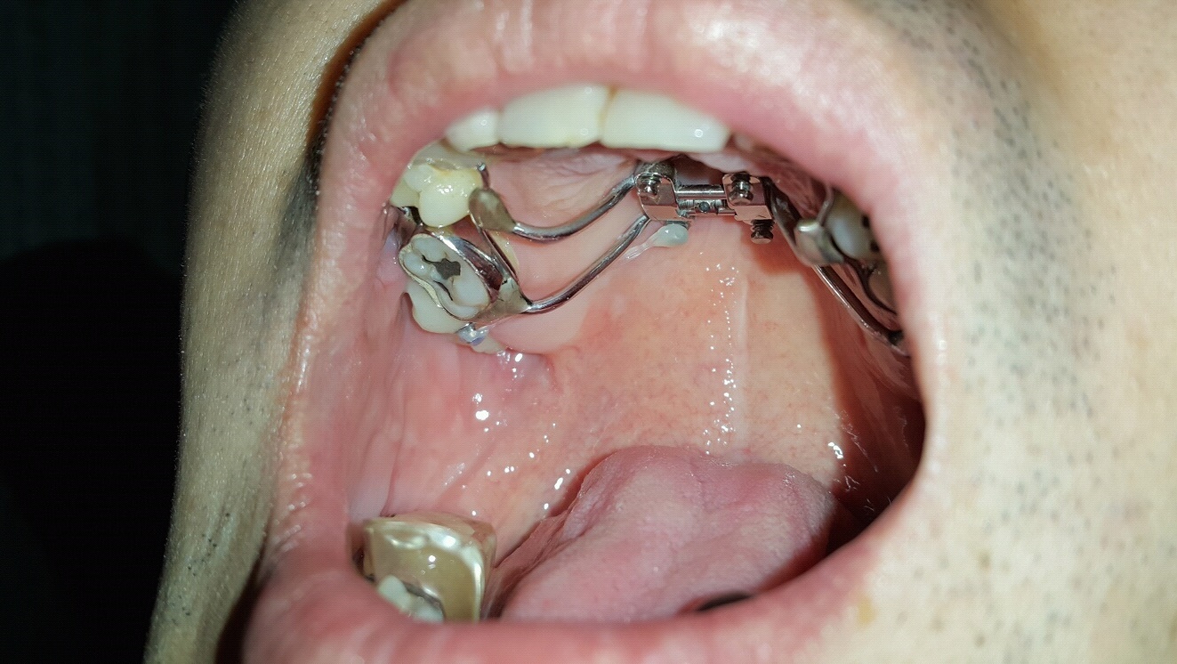 위 사진이 입천장에 작은 나사 4개를 박아서 입천장에 단단히 고정된 상태로 중앙에 나사 돌리는 곳이 있는데 쇠붙이같은걸 끼워서 양쪽 어금니 포함 4개를 쇠의 힘으로 조금씩 벌어지게 해서 치아들의 자리를 잡는 과정.