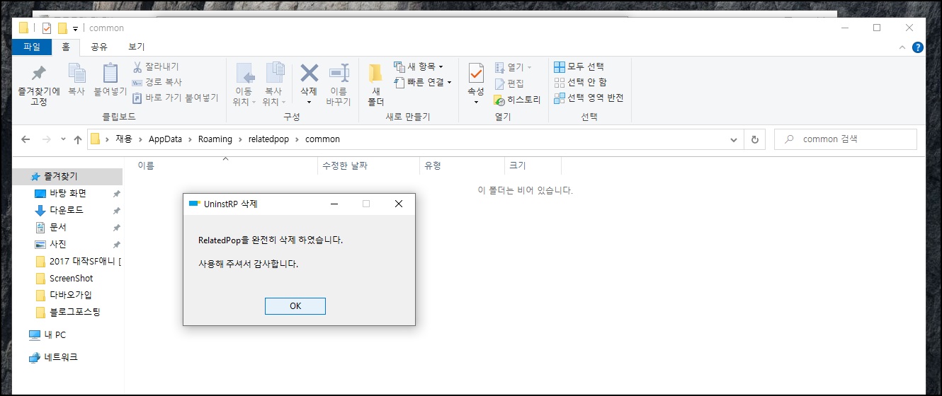 삭제를 잘 하셨다면 보시는 것 처럼 아까 있던 위치에 악성강제 광고창이 뜨는 코드의 원인인 놈이 안보일겁니다.