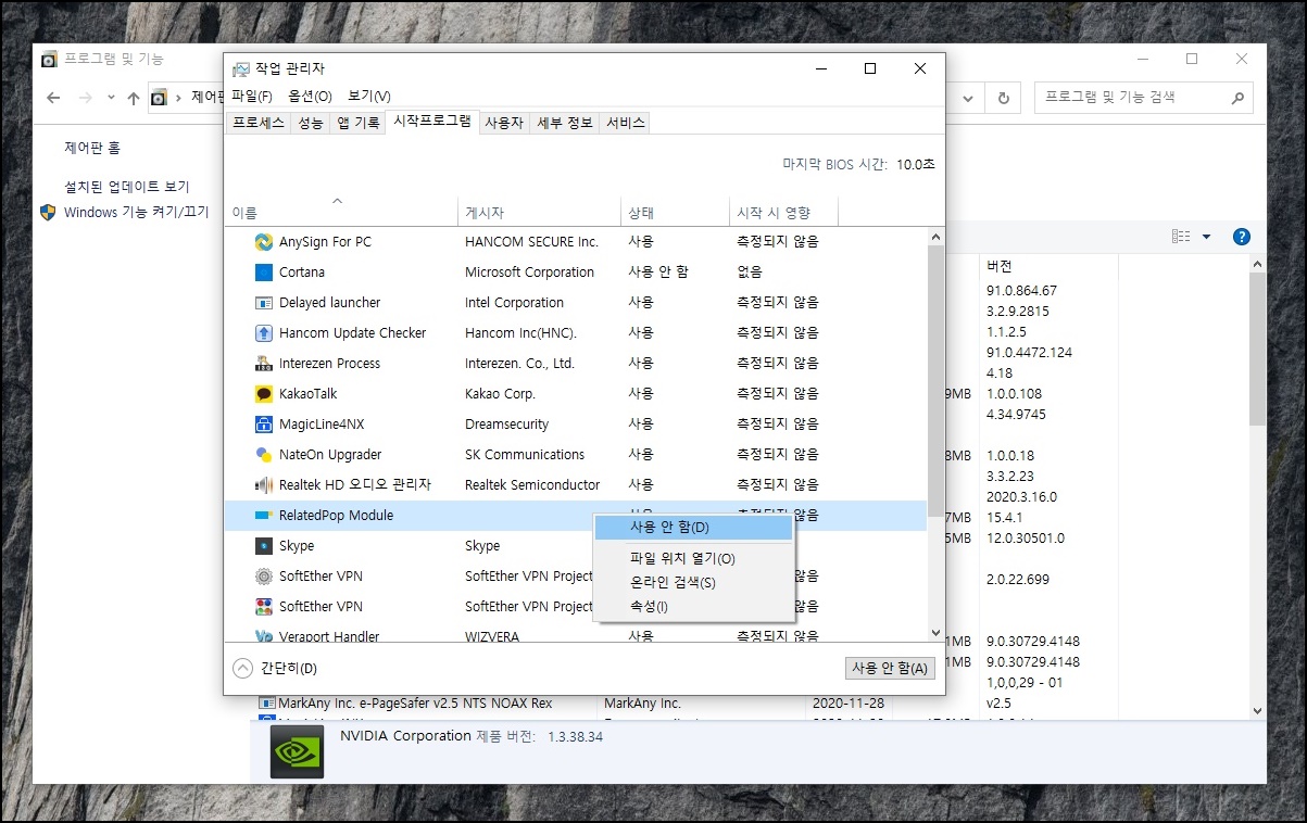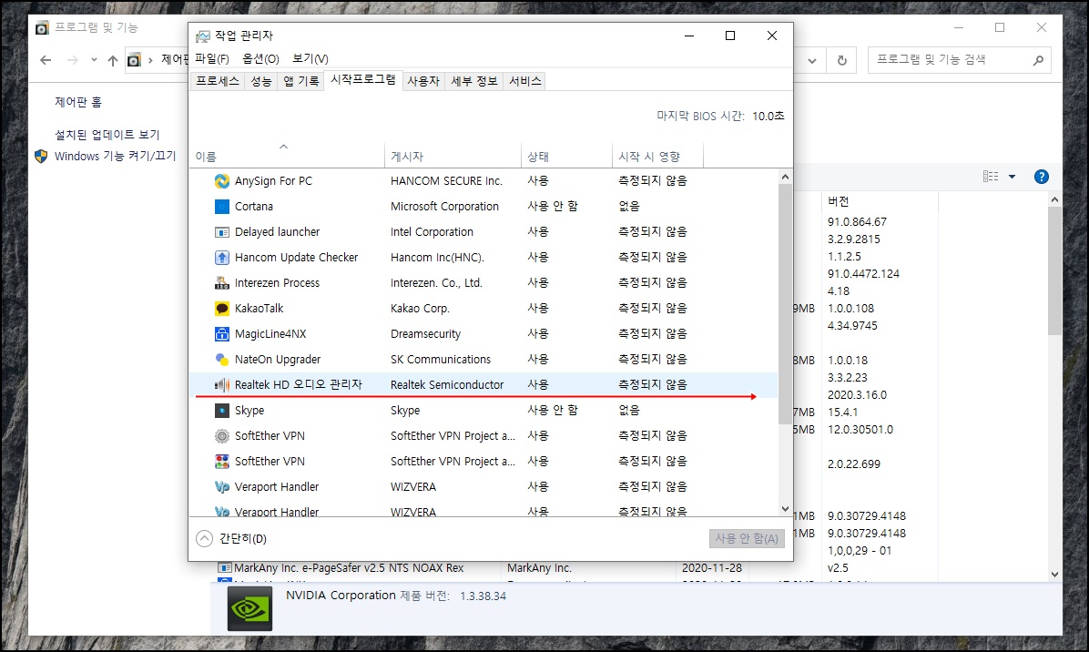 작업관리자/시작프로그램 항목으로 들어가봤습니다.