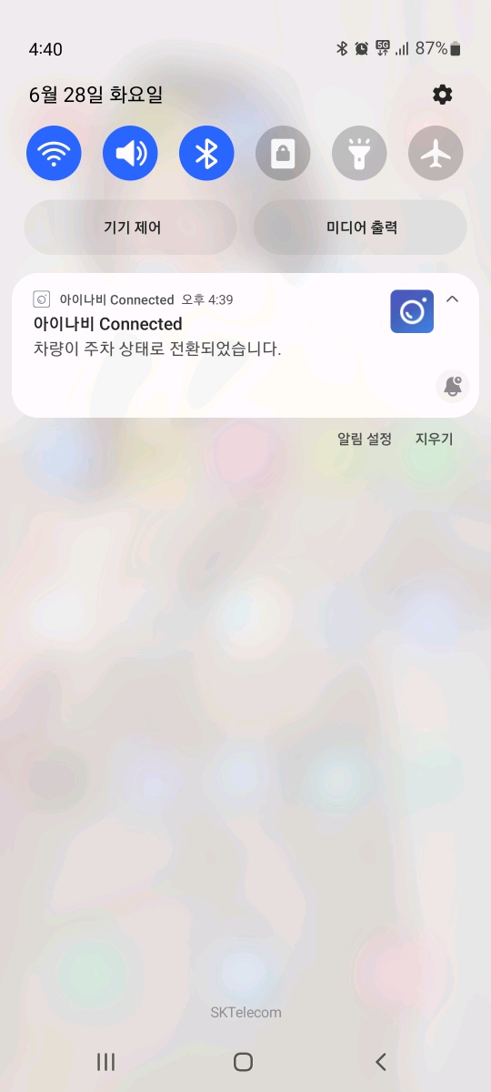 주행중엔 앱 작동 불가이고요, 주차중일 땐 이렇게 주차모드 중이라고 알람 옵니다.