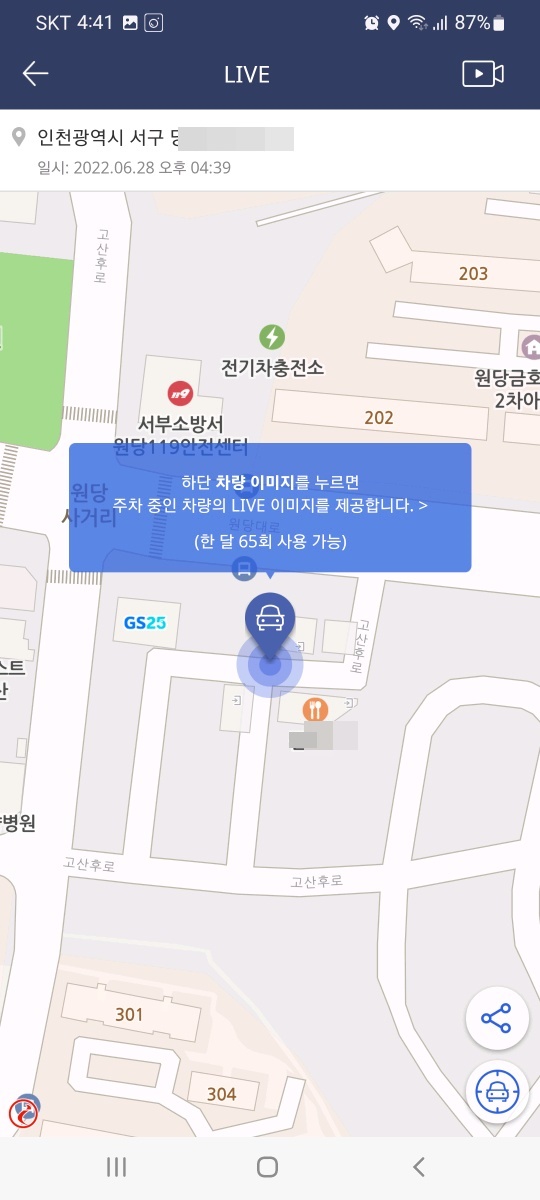 내 차가 주행하다가 마지막으로 주차되어 있는 곳 요렇게 앱에 표시 되고요.