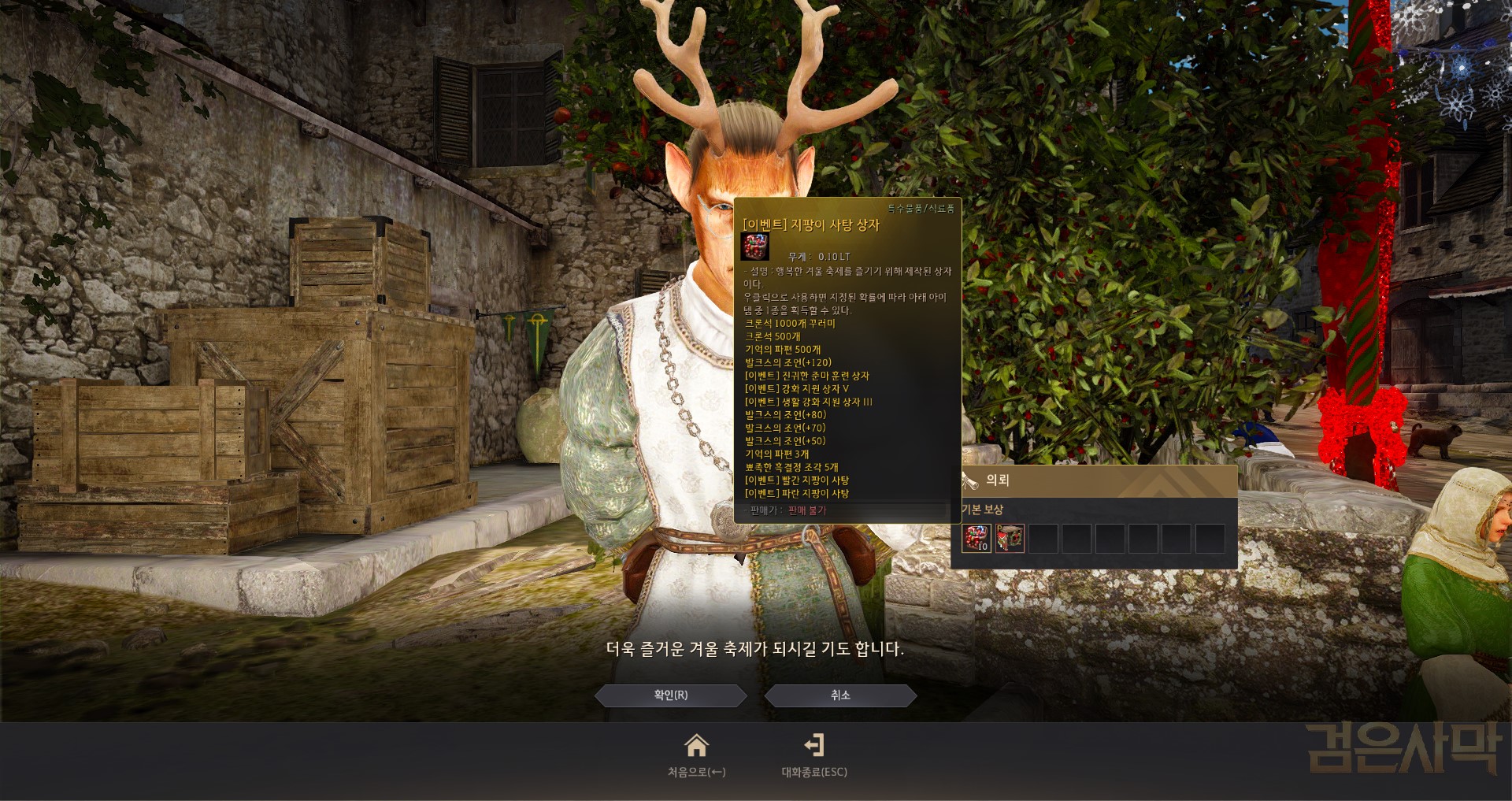 완료하면 지팡이 사탕상자 10개랑, 젼혀~ 필요없어 보이는 의자도 하나 줍니다..