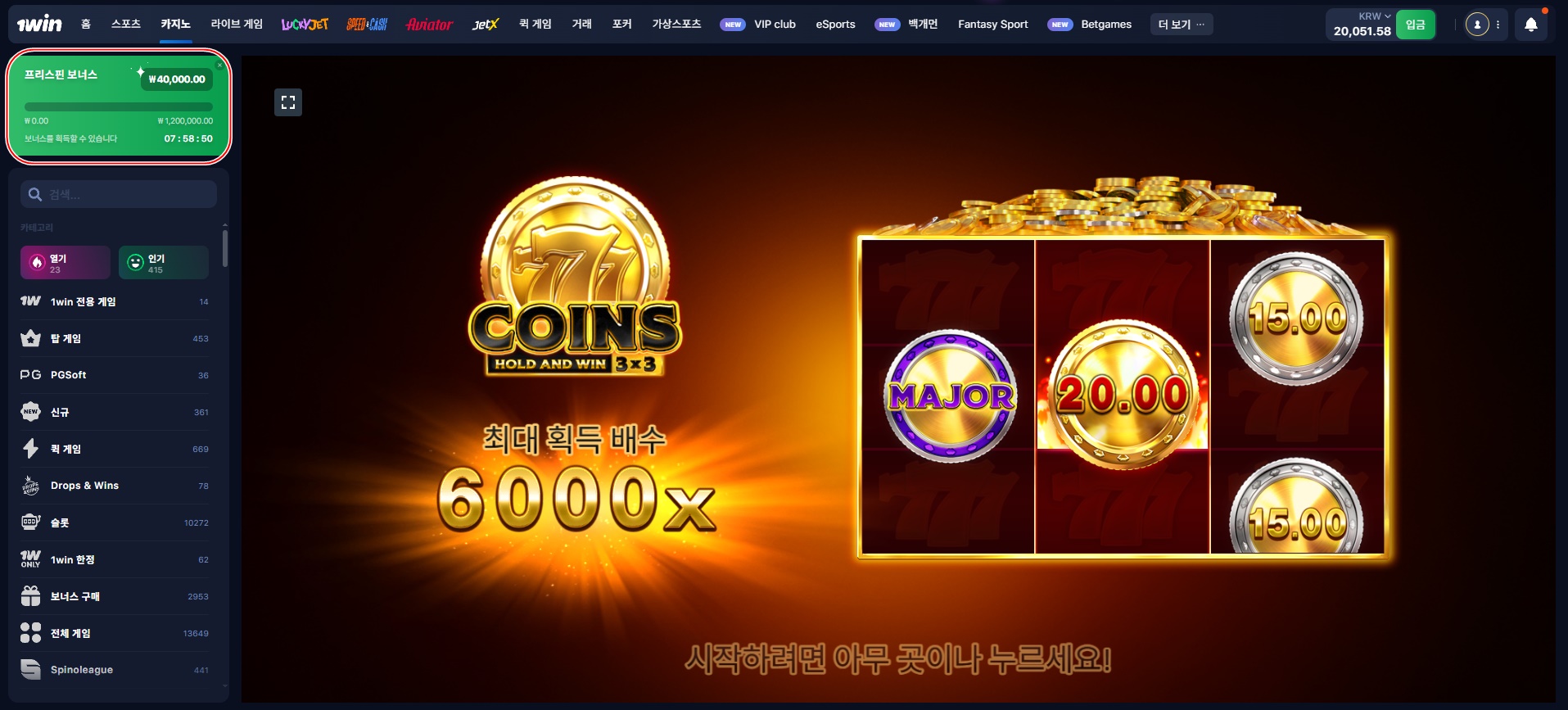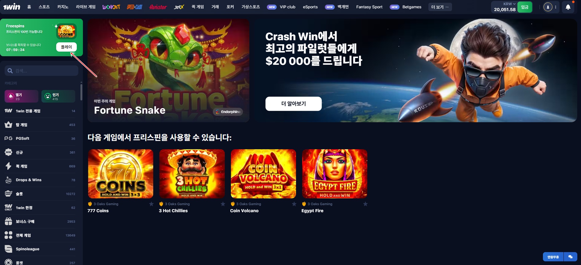 가입하고 2만원 입금하니 금액에 따라 무료스핀 준다고 해서 한번 플레이 해봤습니다.
