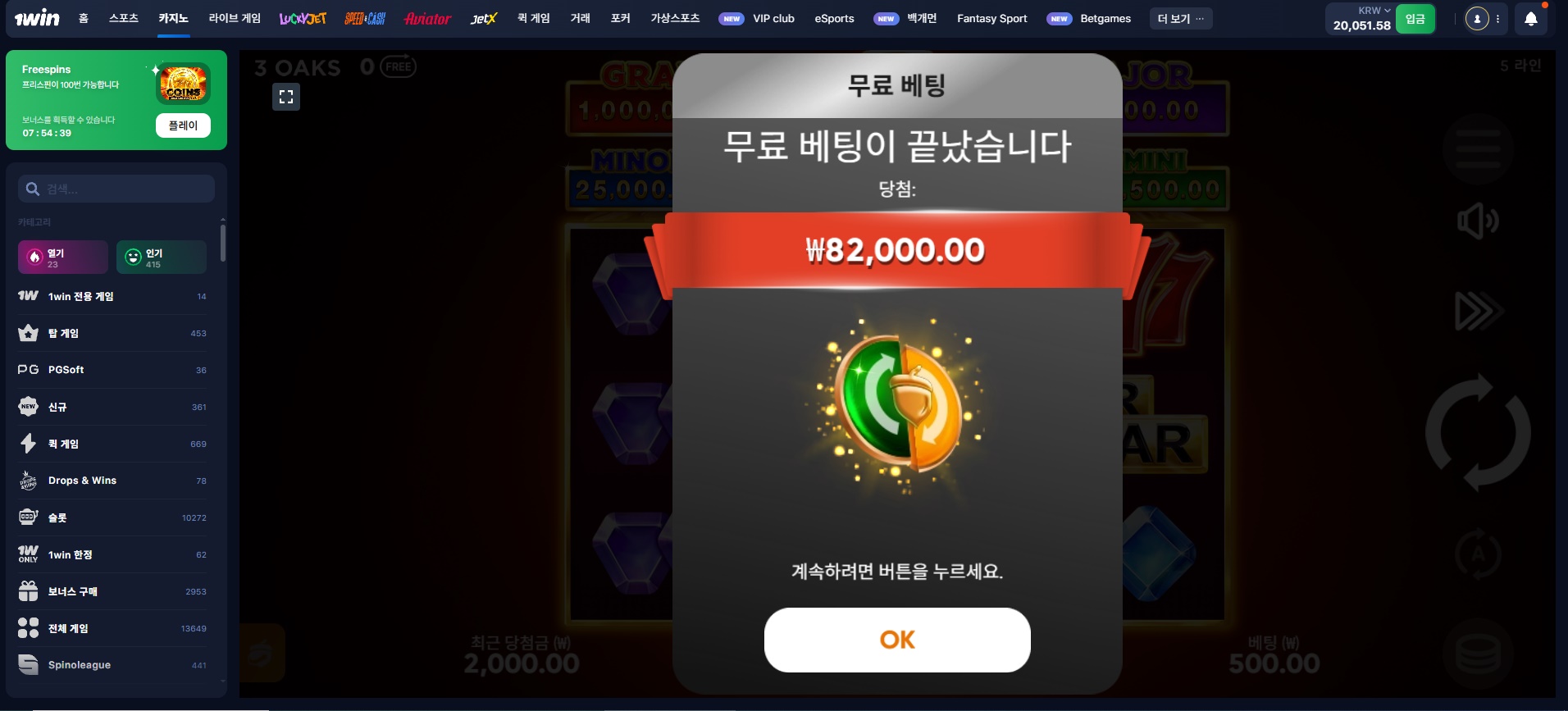 저는 100프리스핀을 받아서 플레이 했고, 프리스핀에서 82,000을 이겼었죠...